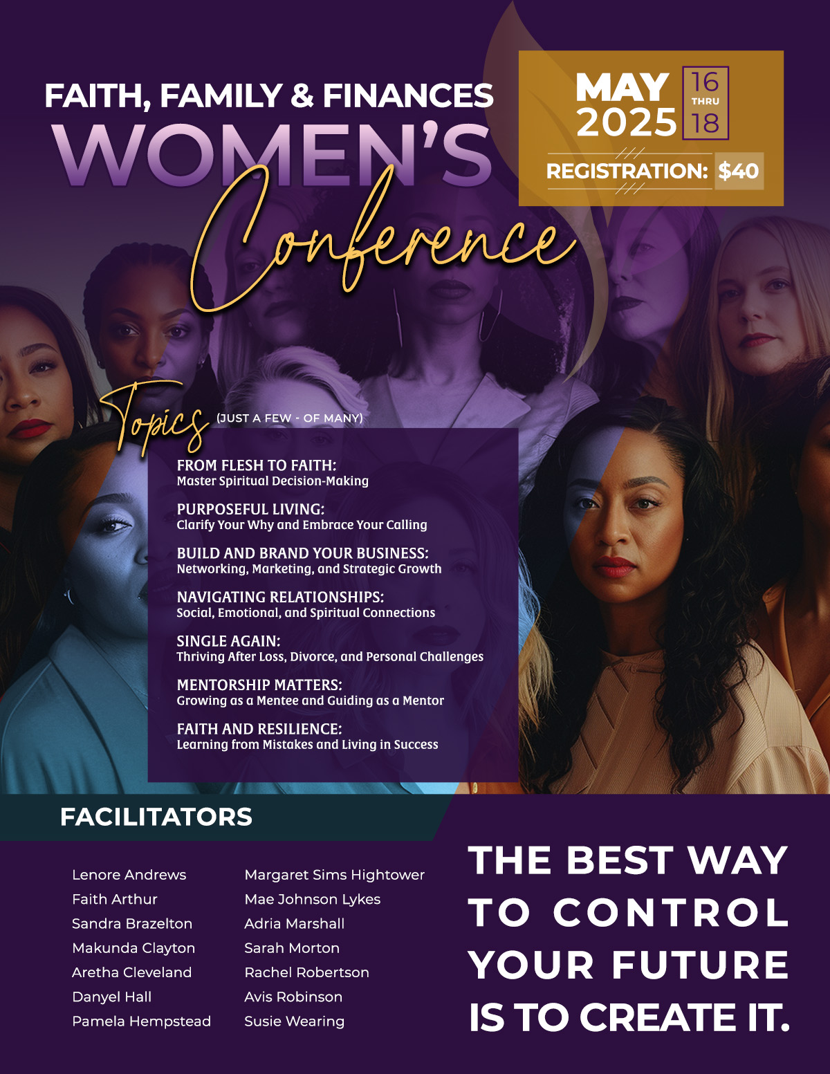 Spiritually maturing women will help deepen your walk with God by using biblical principles. As you listen to their journeys, you may discover and/or rediscover your purpose as you reflect on your faith journey. You will hear from knowledgeable and spiritually inspiring women and receive a wealth of information.
